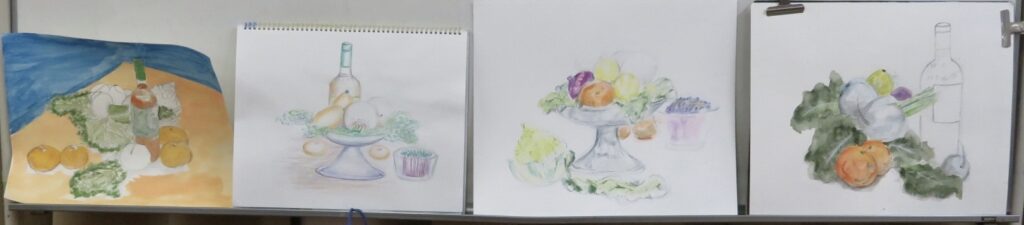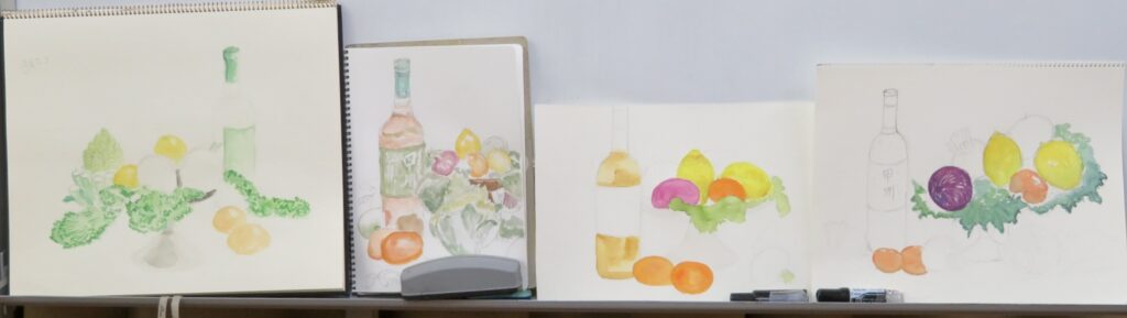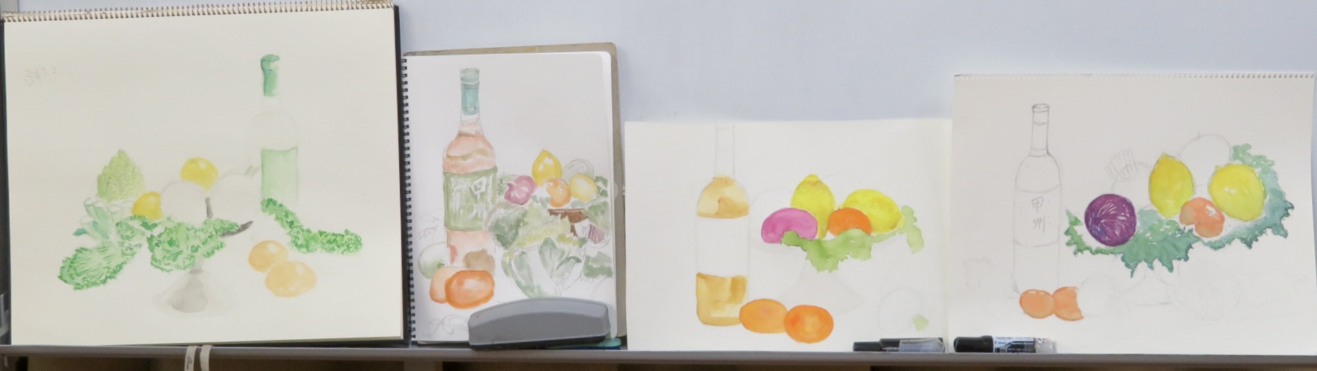 デッサンしてからの彩色、なかなか時間内に終わらず、またもや自宅で仕上げます。