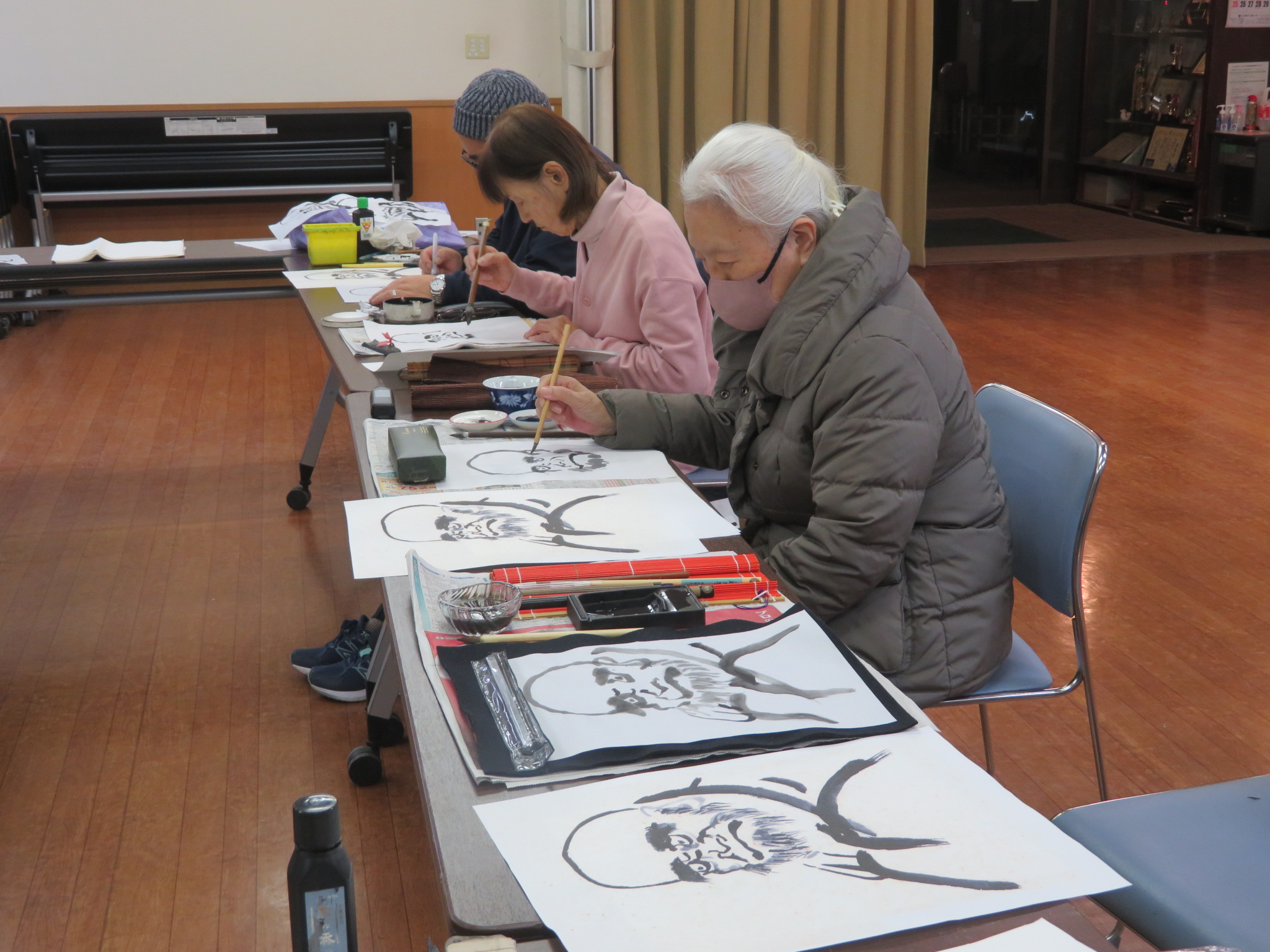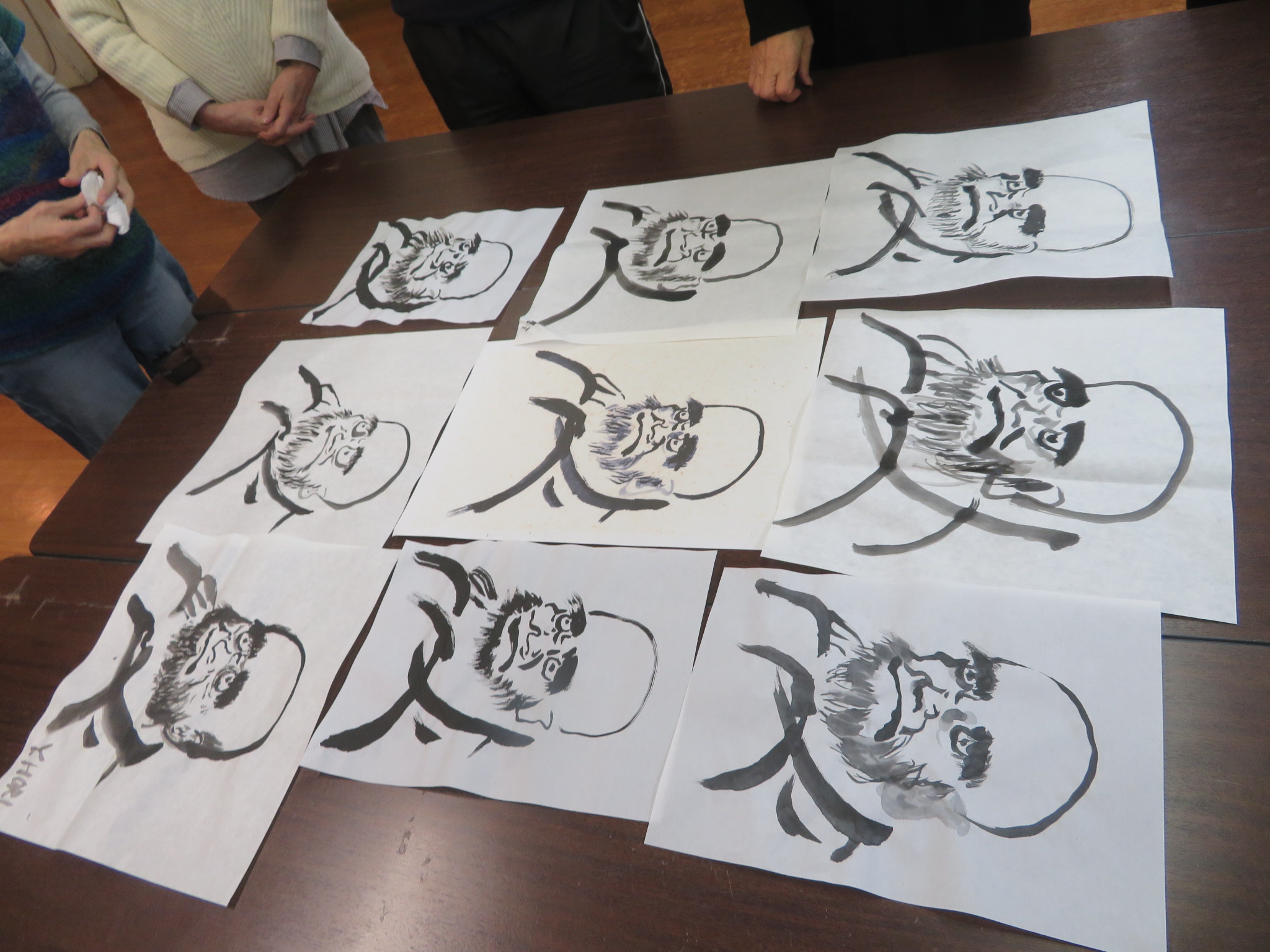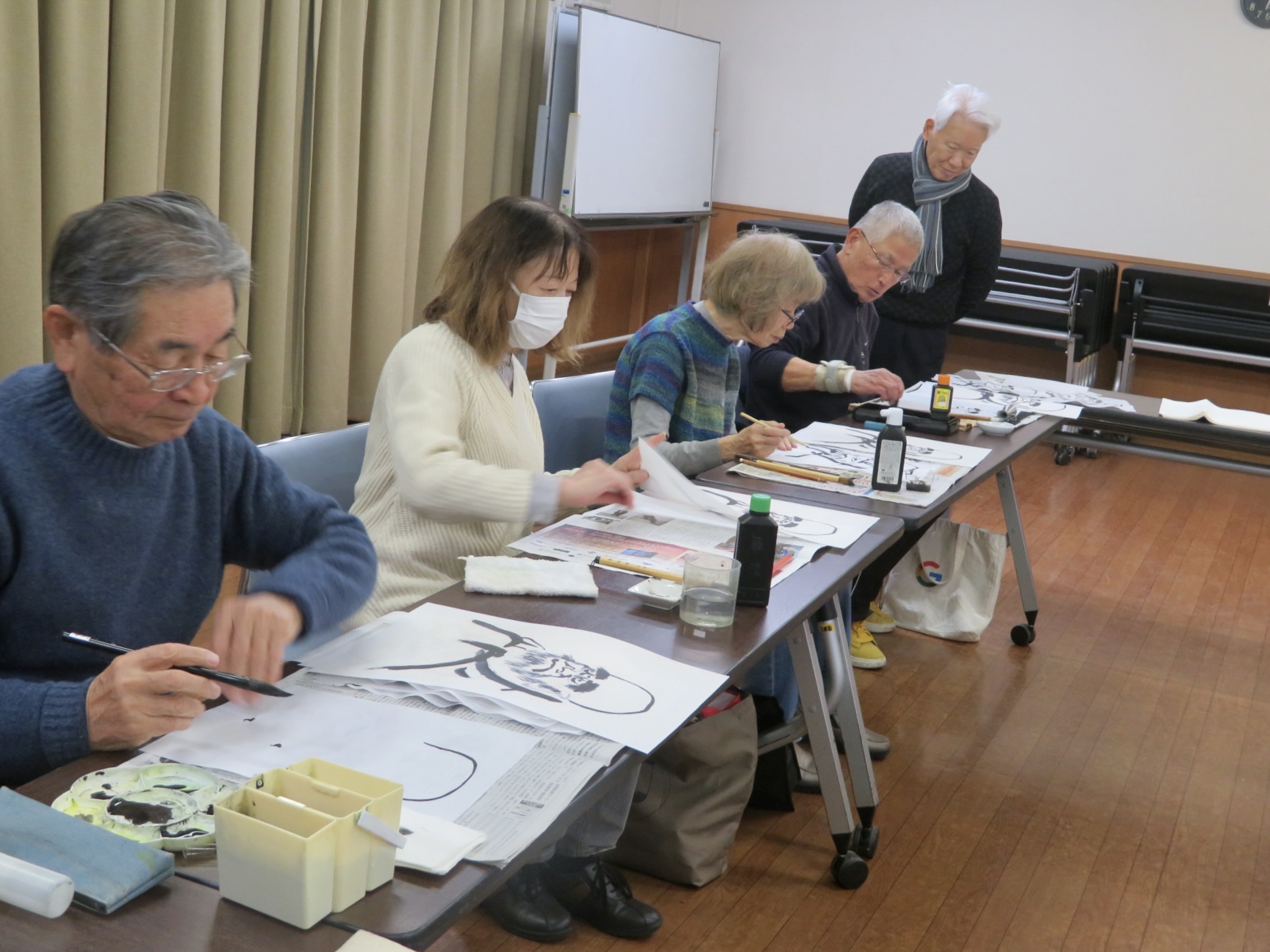 毎年1月恒例の常岡さんにご指導をいただき、墨彩画を楽しむ回。1年に1度でも、