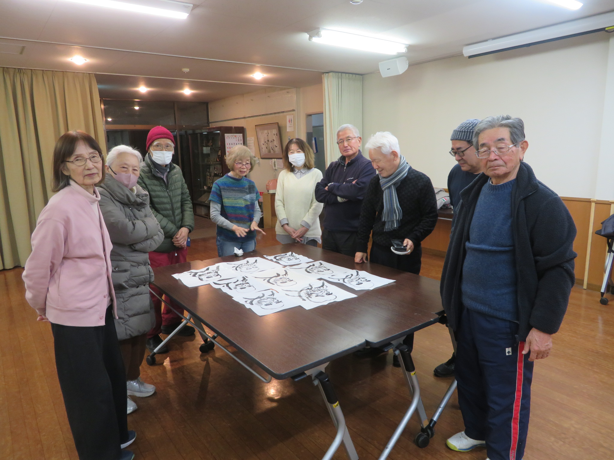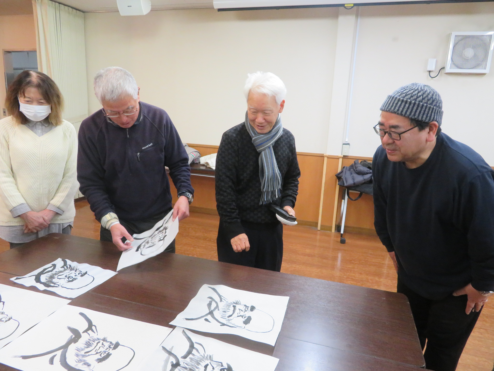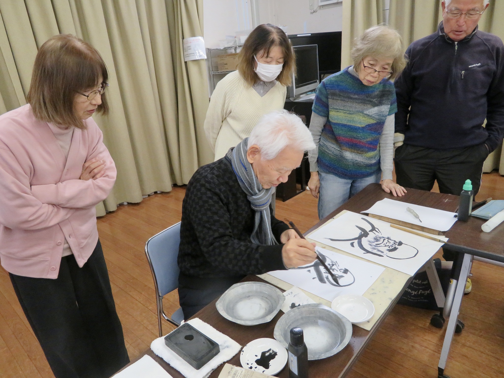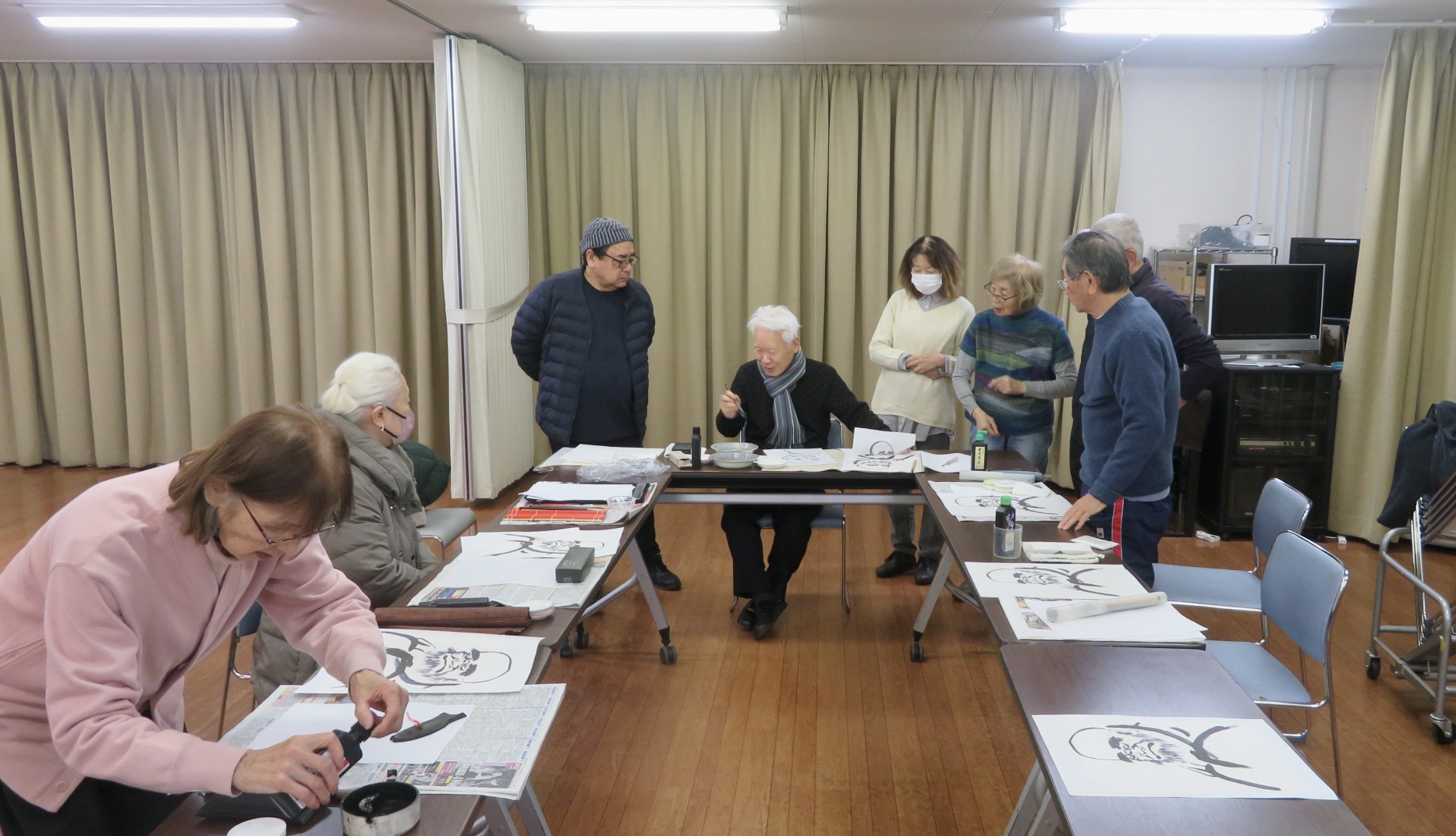 毎年1月恒例の常岡さんにご指導をいただき、墨彩画を楽しむ回。1年に1度でも、