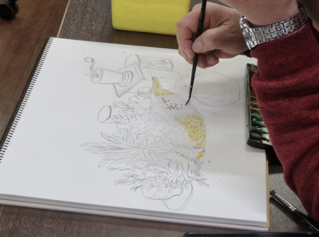 デッサンから開始。全体の形を掴むのに苦労しながらも、なんとか彩色までこ
