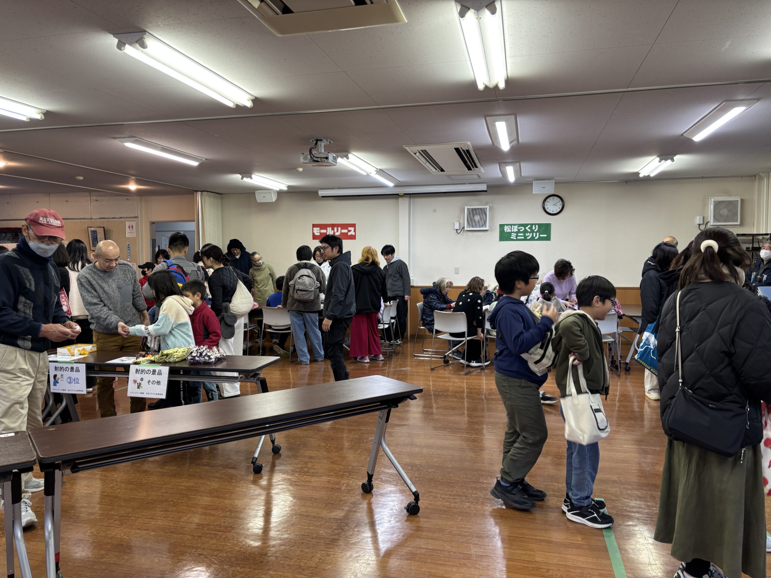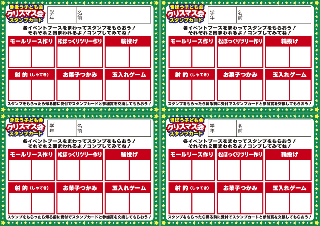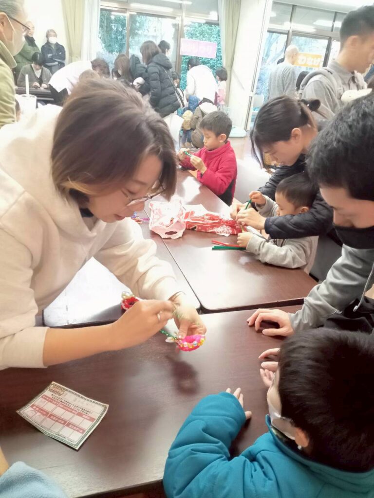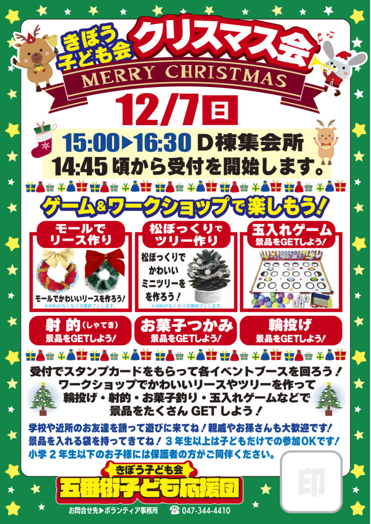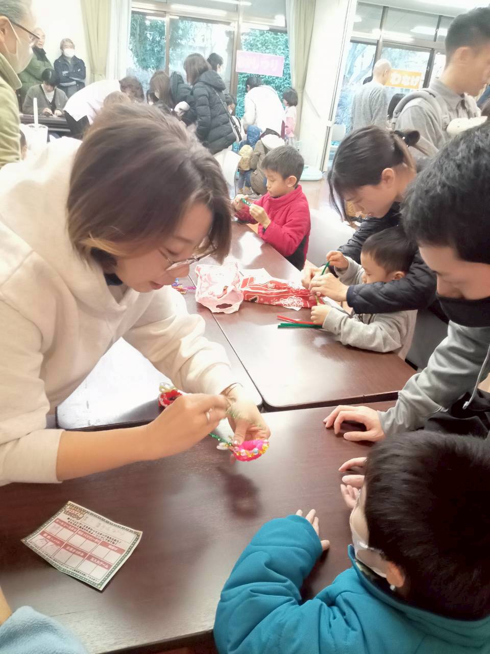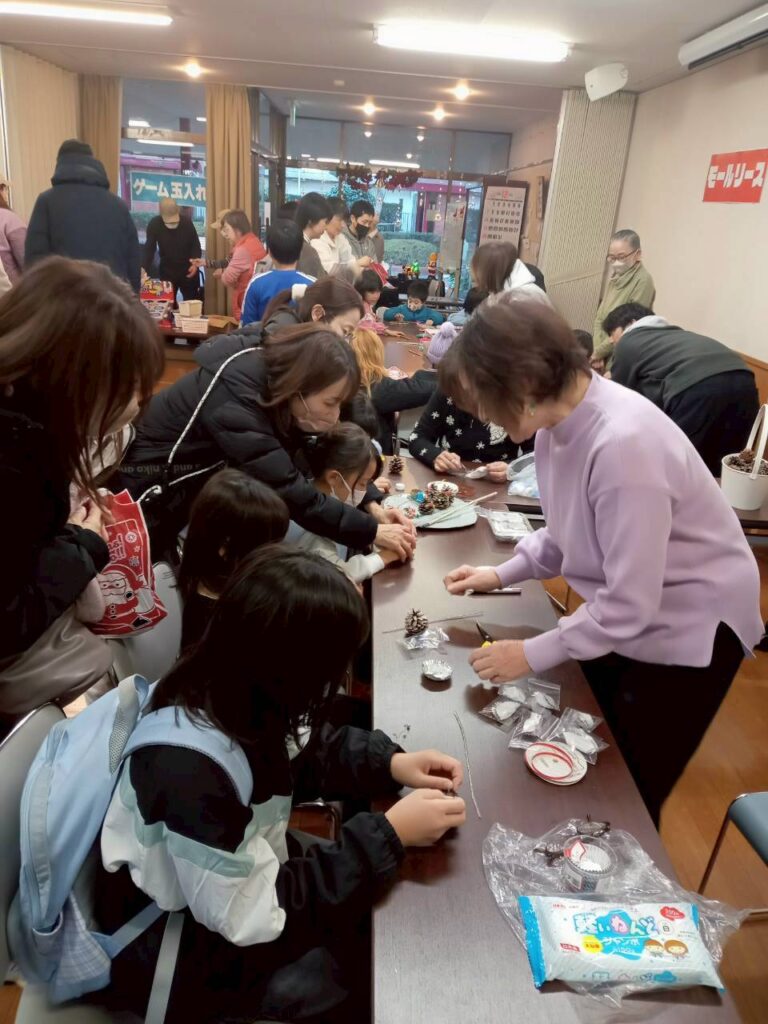 今年は、「ゲーム&ワークショップ」として子供達が自由に好きなブースを巡ってゲームをしたり、「モールのリース」や「松ぼっくりツリー」を作りました。学校のお友達と一緒に楽しんだり、お母さんやお父さんと一緒にゲームを楽しんだりしました。