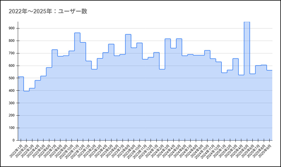 ホームページを利用している「ユーザー」の合計数となります。【ユーザー数】≒【利用端末の数】に近い値です。1人で2台のパソコンと1台のスマホでアクセスした場合は3とカウントされます。1ヶ月単位での重複ユーザー(端末)はカウントされません(※Aさんが1台のパソコンで1月に1回アクセスして、1台のスマホで3回アクセスしても「表示回数」は4ですが「ユーザー数」は2となります)厳密には少し異なるようですが、概ねその様に考えて問題ありません。