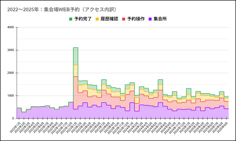 集会所のWEB予約が実装されたため、予約に関しては「集会所(閲覧)」「予約操作」「予約完了」「履歴確認」それぞれにアクセスを分類して分かりやすく表示しています。