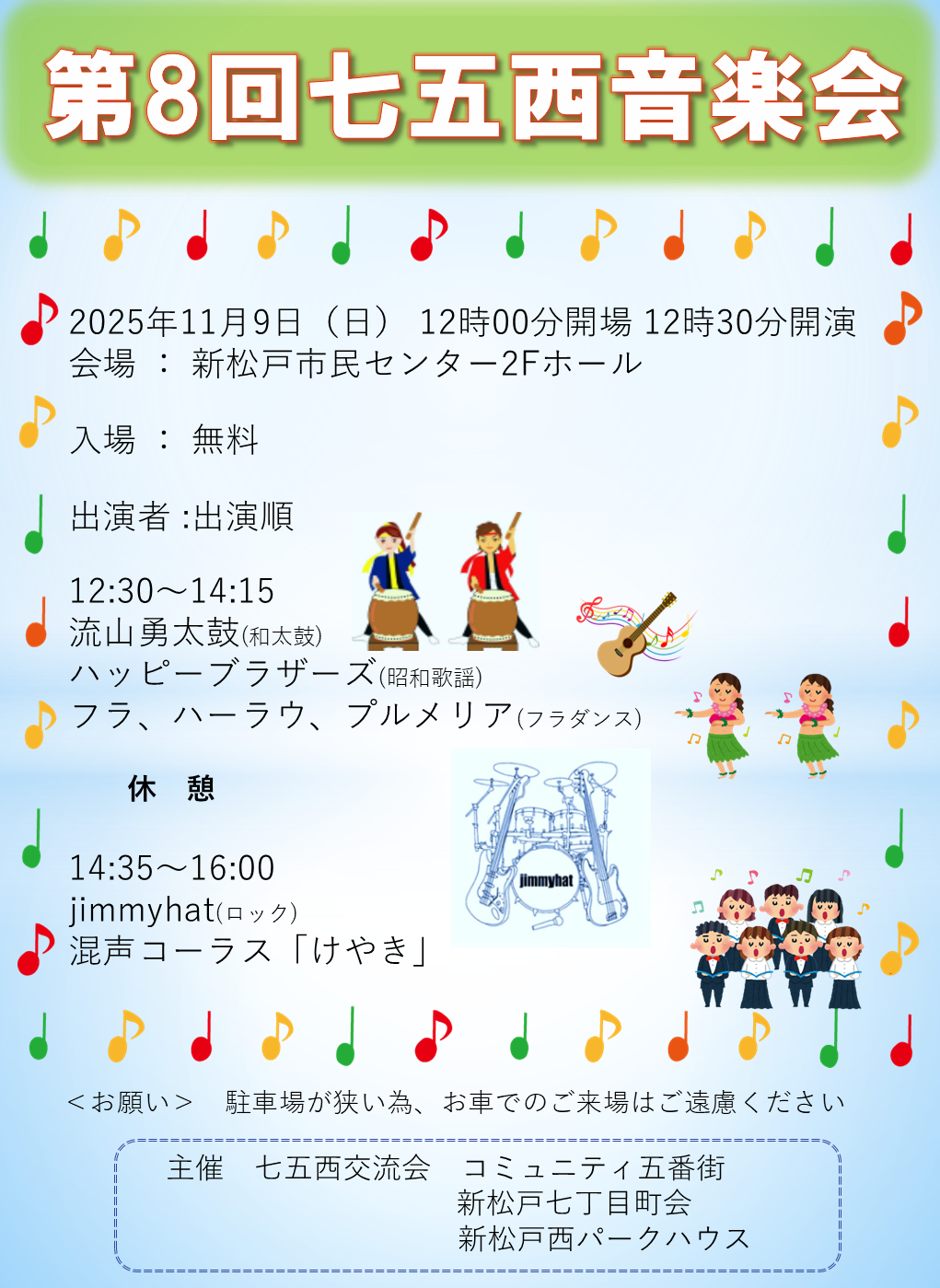 七五西交流会文化祭第8回音楽会のお知らせ お知らせ 2025.10.29 七五西交流会文化祭の音楽会は、第1回を新松戸西小学校にて2009年10月25日に開催してから2年に1回のペースで開催してまいりました。(コロナ禍で2021年度は中止)今年度は、来る11月9日(日)に新松戸市民センター2階ホールにて第8回を開催いたします。五番街からは、『フラ、ハーラウ、プルメリア』様と『混声コーラス「けやき」』様の2組がご出演されます。五番街の皆様のご来場をお待ちします。
