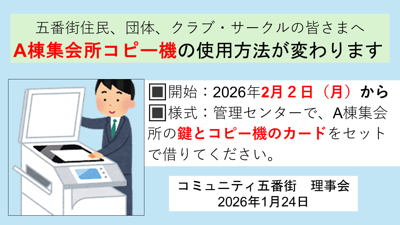 住民限定 : 【使用方法の変更】A棟集会所内コピー機 お知らせ 2026.01.24 このコンテンツは住民限定です。パスワードをお忘れの方は管理センターにお問い合わせください。(※理事限定など、更に限定されたものは担当者専用のパスワードの為、閲覧できません)