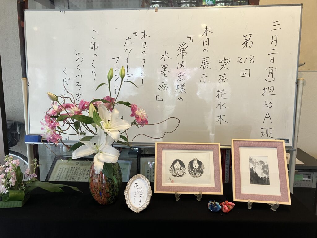 第218回 喫茶花水木「常岡宏さんの水墨画展示」 喫茶花水木 2026.03.03 2026年3月2日(月) 13:00~16:00 今回の展示のために、春をテーマに描かれた水墨画です! 春望 国破れて山河あり~ 春暁 春眠暁を覚えず~ ~ 十二支の色紙。 常岡さんから作品の説明など話して頂きました。 男性の来場者が多く、熱心に鑑賞されていました。