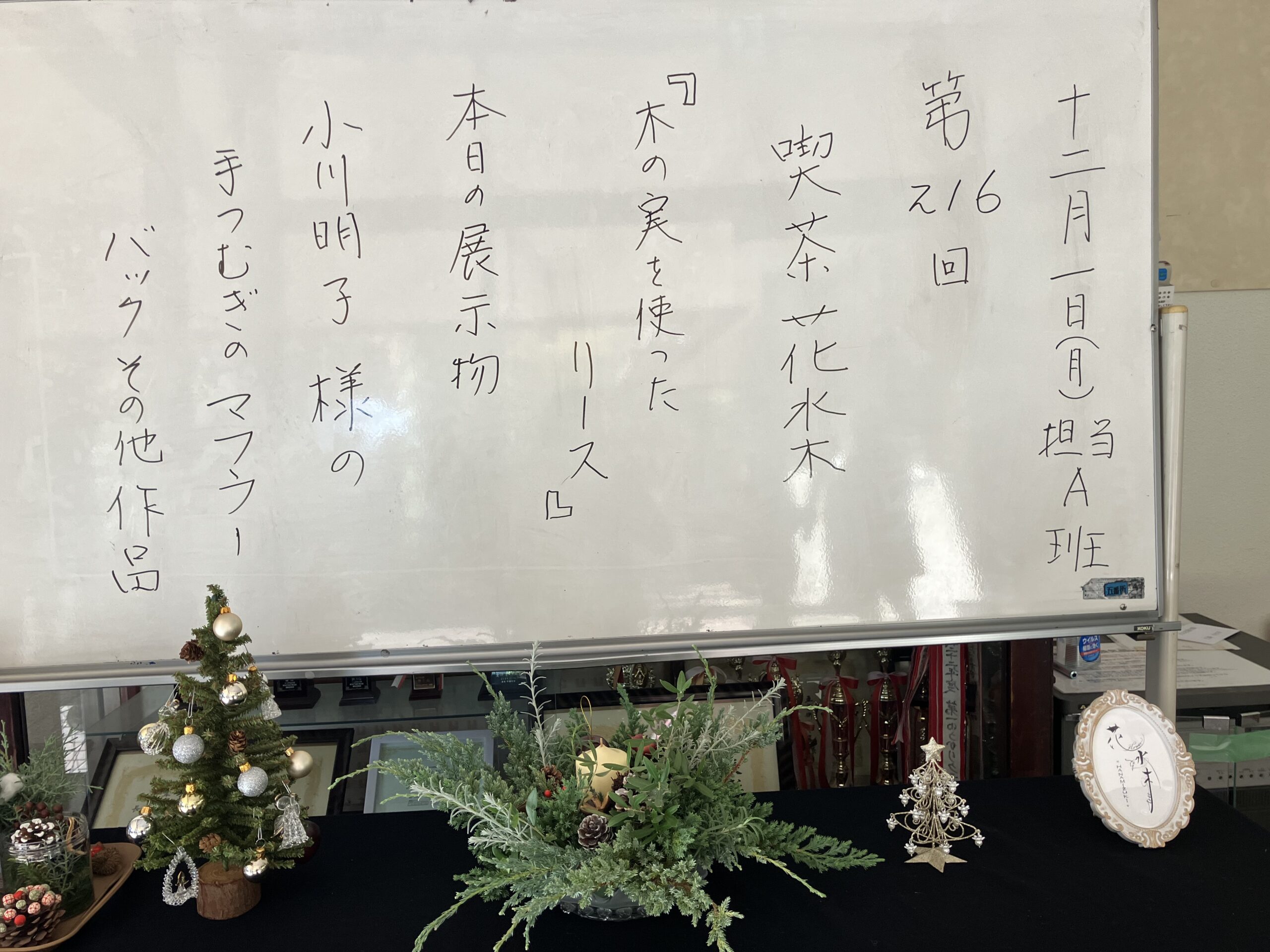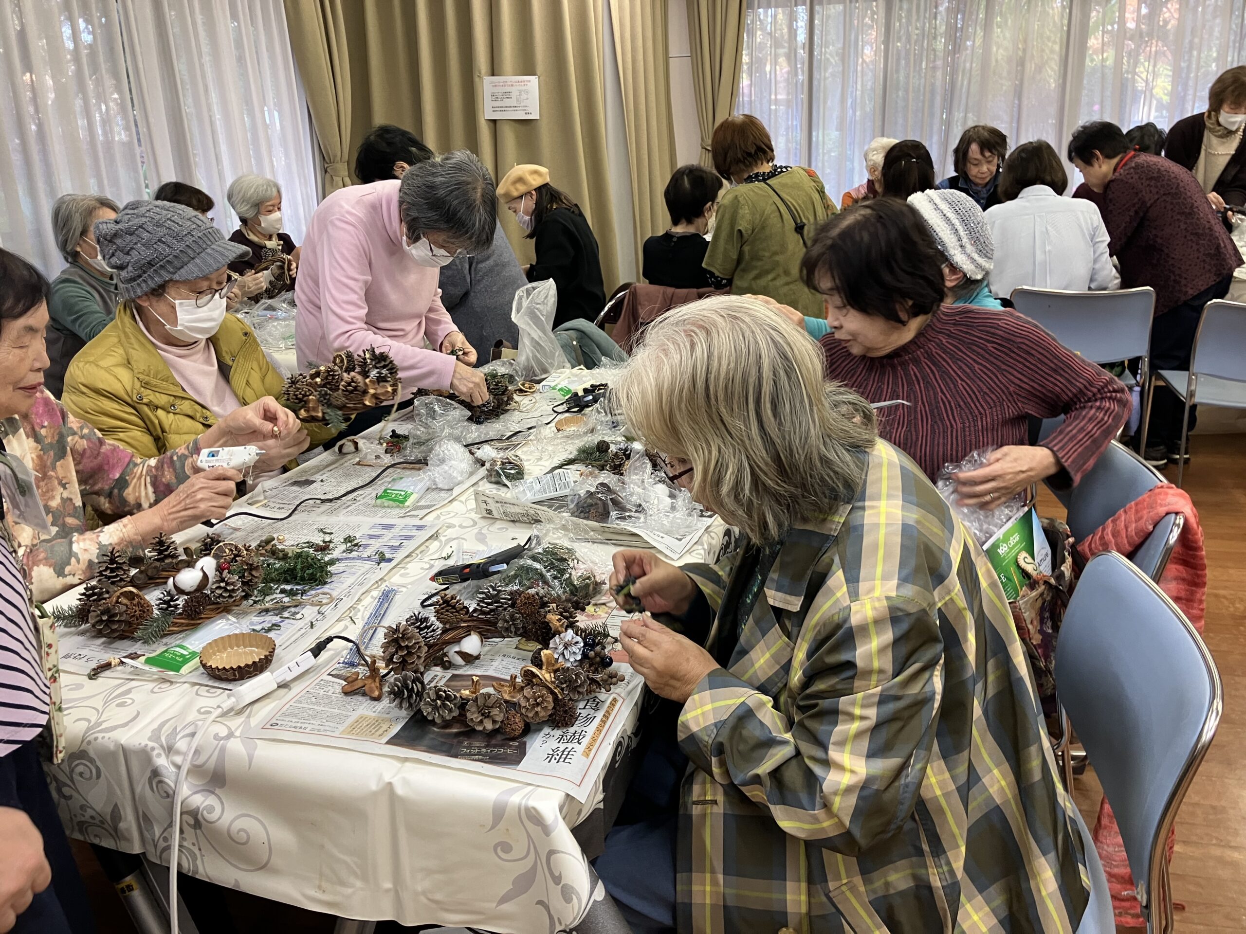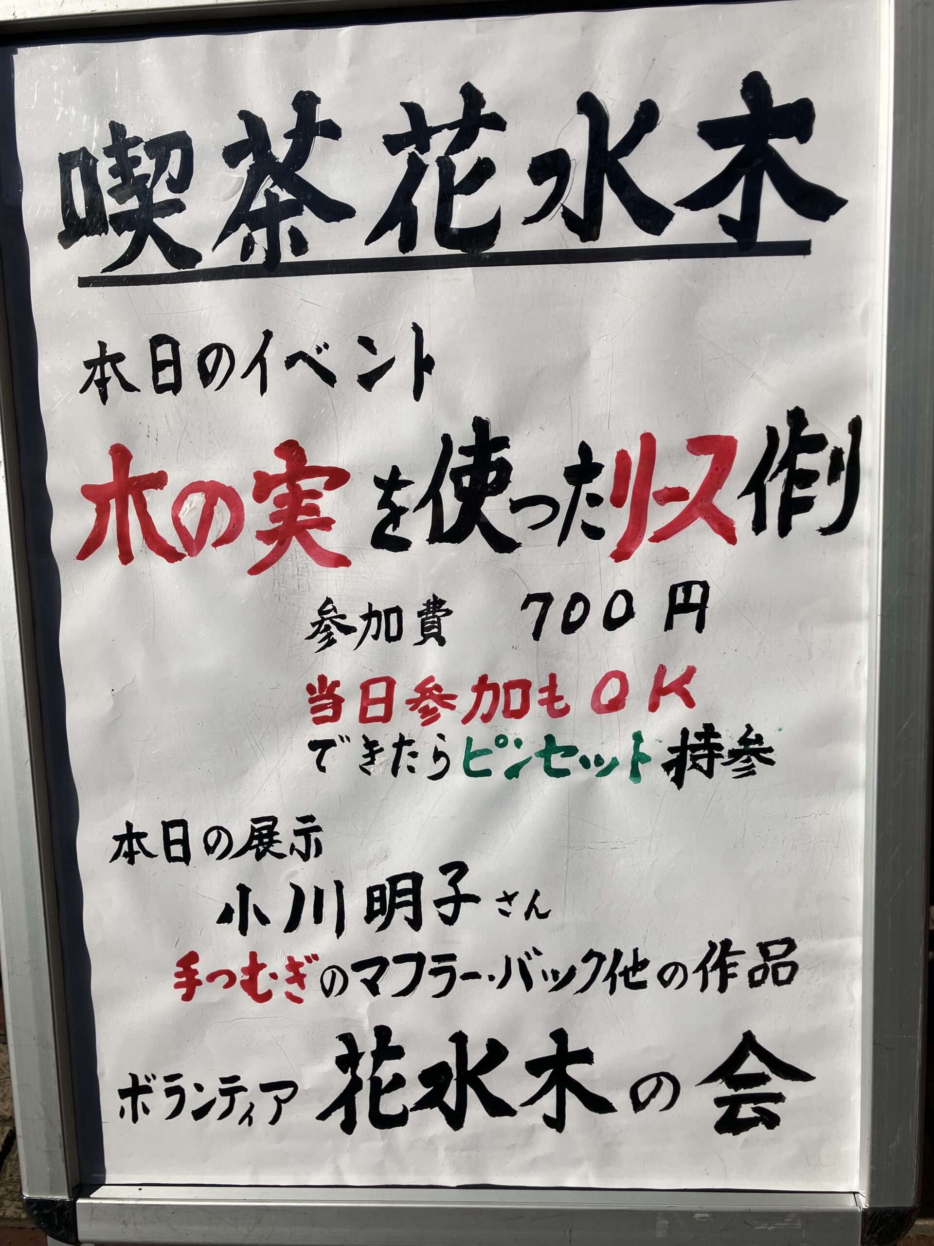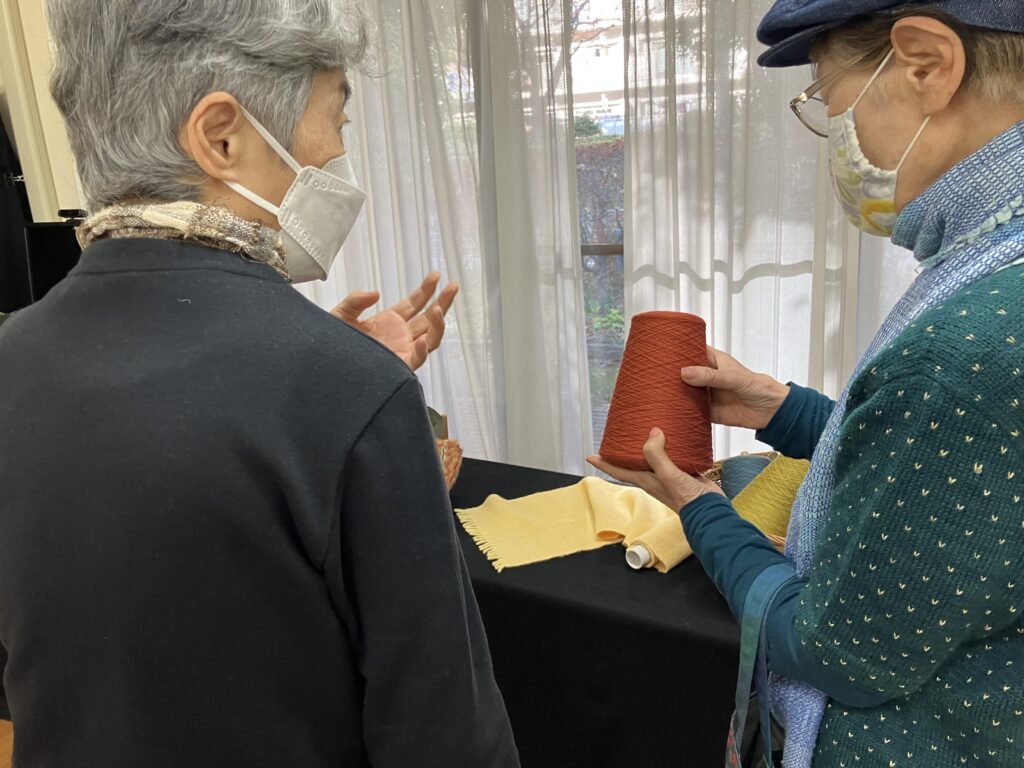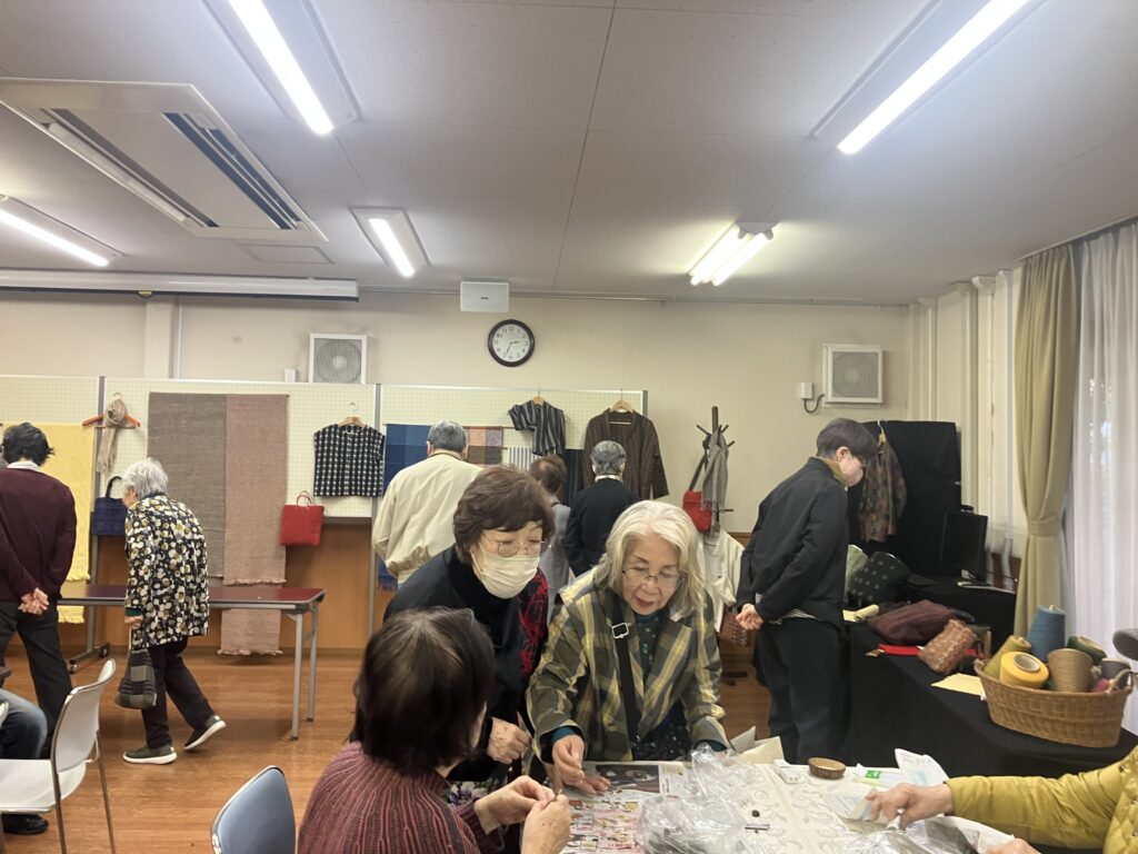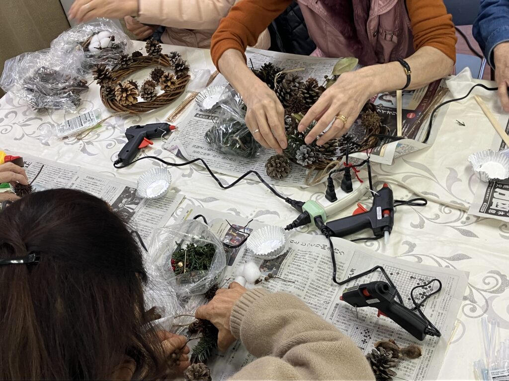 第216回 喫茶花水木 イベント「木の実を使ったリース作り」 展示「小川明子さんの手つむぎの作品」 憩いの場 2025.12.02 2025年12月1日(月) 13:00~16:00 「リース作り」は、30名募集で満員御礼❣ 大盛況! テーブルが足りなくなり大慌てで補充しました。 主な材料は、メンバーが拾い集めた沢山の木の実 リースにボンド・グルーガンで思い思いのデザインで木の実・ドライフルーツ・綿の花など付けてゆきます。 男性もトライ!出来上がりに満足されていました。 素敵に出来上がったリース❣ 織物の作者小川明子とお友達! 手つむぎの作品。羊毛を染色して紡ぎ織り上げた作品もあります。織り上げるのにどれだけの時間を費やされたことでしょう!素晴らしい色と風合いの織物です! 洋服に仕立てた作品や,さき織のバッグも展示。 来場された方は熱心に作品をご覧になっていました。 リースを作り終えた方は、コーヒーを飲みながら一息ついておしゃべりも楽しまれていました。今回は、初めてリース作りと織物作品展示、二つの催しを一緒に行ったので会場は熱気に包まれていました。