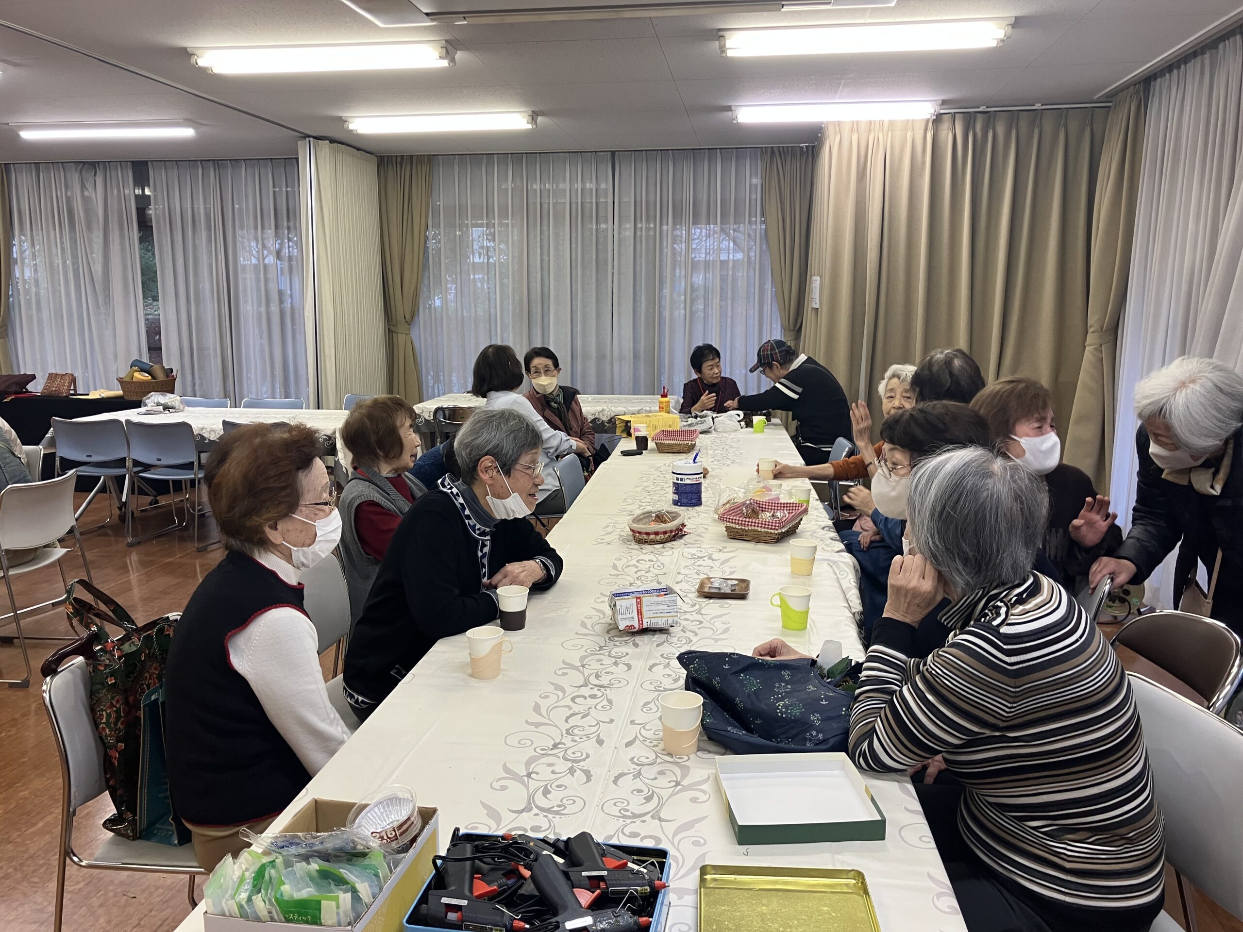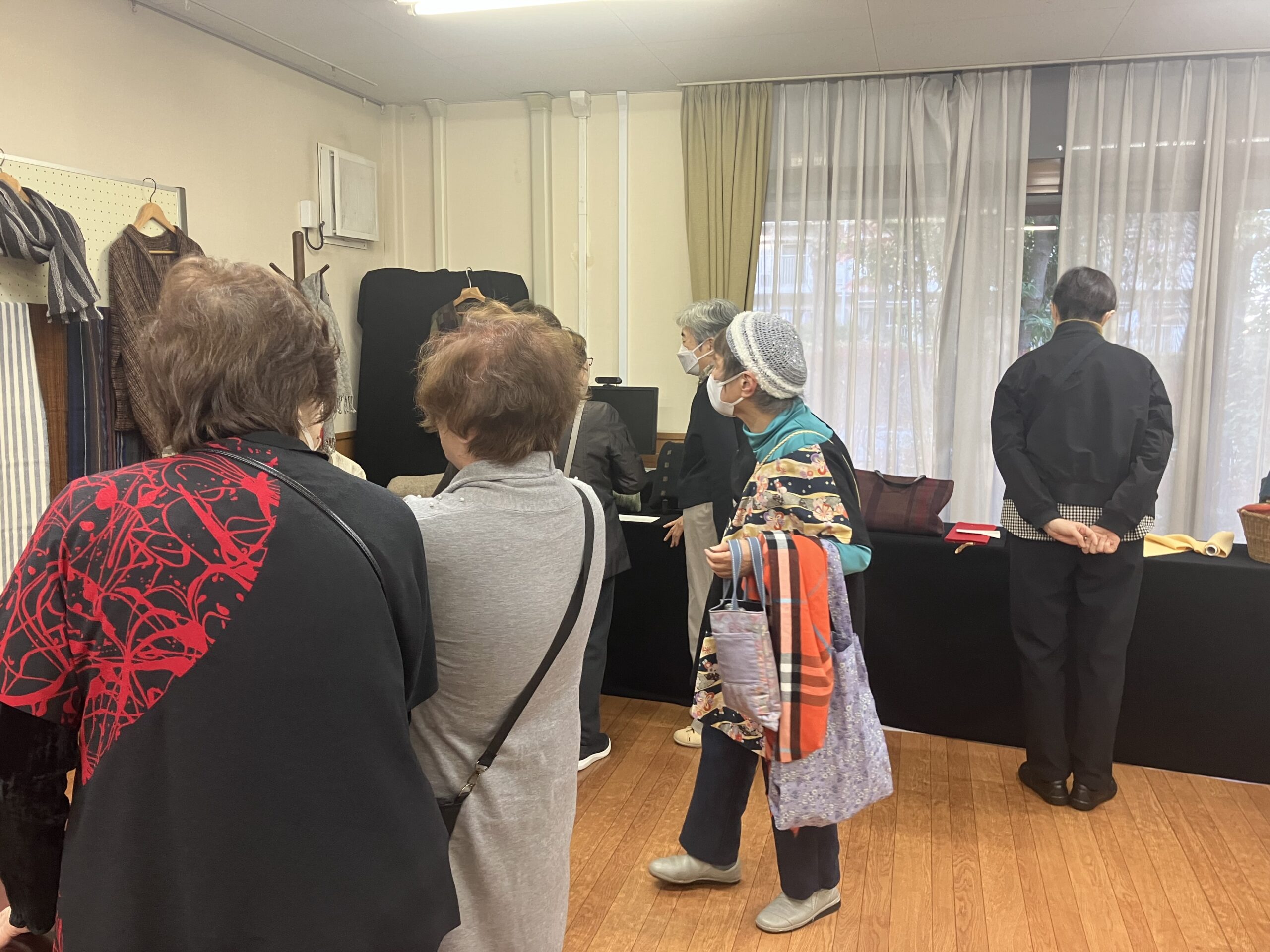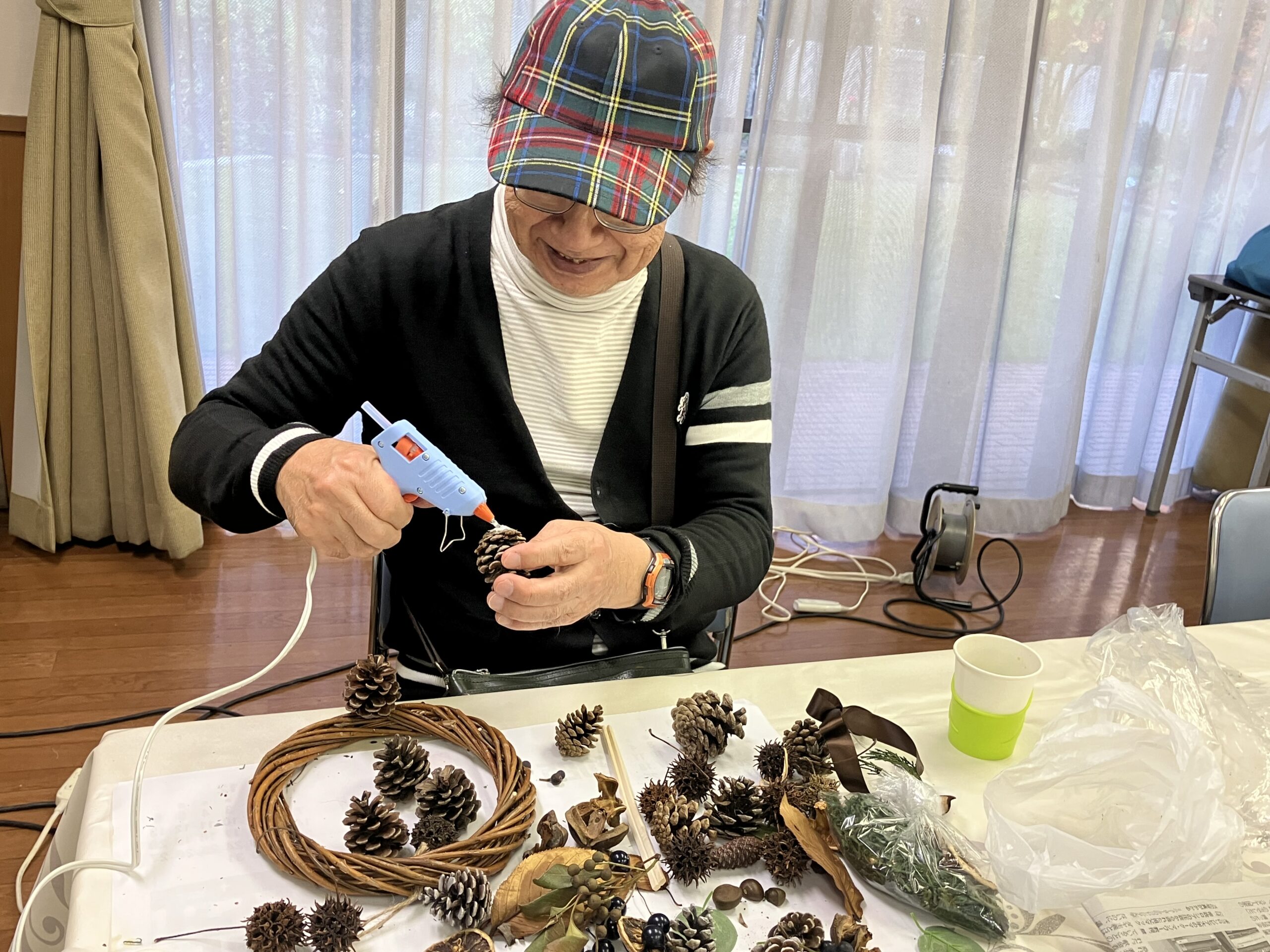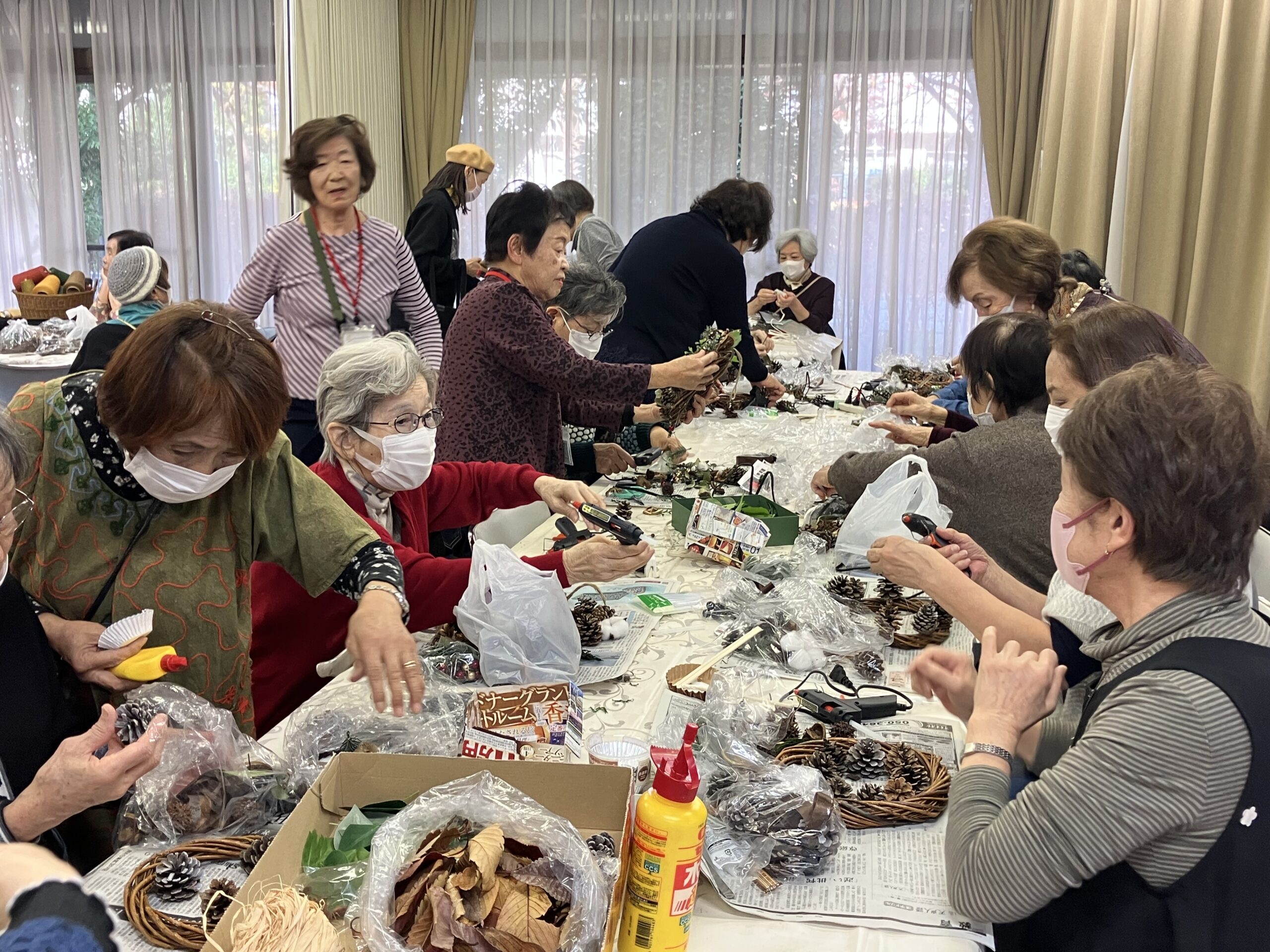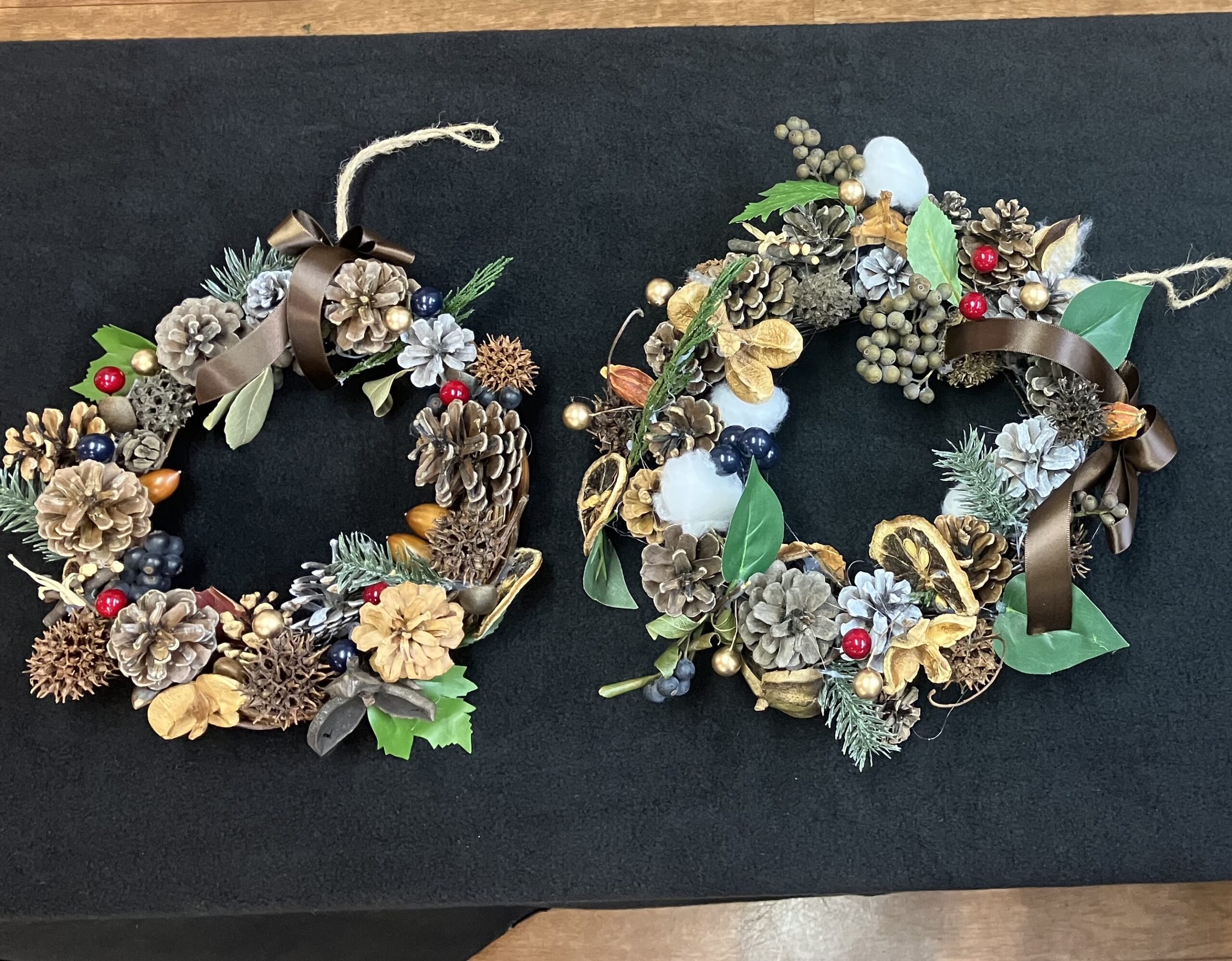 第216回 喫茶花水木 イベント「木の実を使ったリース作り」 展示「小川明子さんの手つむぎの作品」 憩いの場 2025.12.02 2025年12月1日(月) 13:00~16:00 「リース作り」は、30名募集で満員御礼❣ 大盛況! テーブルが足りなくなり大慌てで補充しました。 主な材料は、メンバーが拾い集めた沢山の木の実 リースにボンド・グルーガンで思い思いのデザインで木の実・ドライフルーツ・綿の花など付けてゆきます。 男性もトライ!出来上がりに満足されていました。 素敵に出来上がったリース❣ 織物の作者小川明子とお友達! 手つむぎの作品。羊毛を染色して紡ぎ織り上げた作品もあります。織り上げるのにどれだけの時間を費やされたことでしょう!素晴らしい色と風合いの織物です! 洋服に仕立てた作品や,さき織のバッグも展示。 来場された方は熱心に作品をご覧になっていました。 リースを作り終えた方は、コーヒーを飲みながら一息ついておしゃべりも楽しまれていました。今回は、初めてリース作りと織物作品展示、二つの催しを一緒に行ったので会場は熱気に包まれていました。