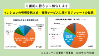 お知らせ 住民限定 : マンションの管理委託方式/菅理サービスに関するアンケート結果 このコンテンツは住民限定です。パスワードをお忘れの方は管理センターにお問い合わせください。(※理事限定など、更に限定されたものは担当者専用のパスワードの為、閲覧できません) 2025.10.15 お知らせ外部委託/合理化検討委員会理事会情報